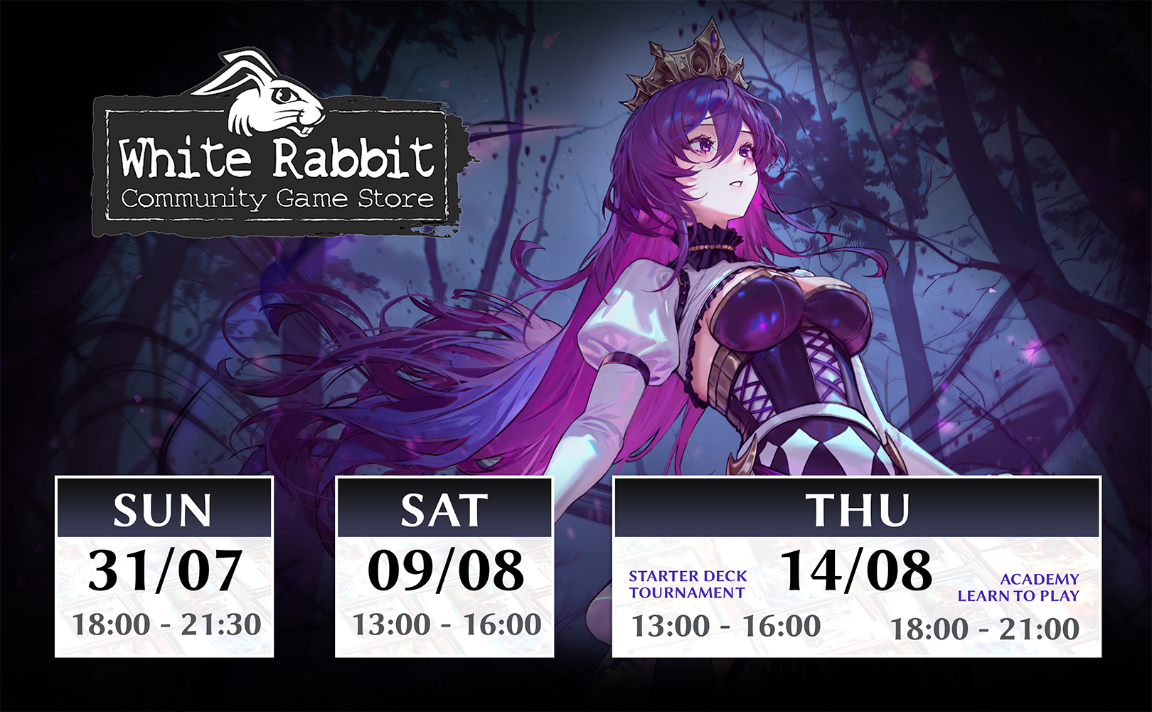 3 Distorted Reflections 1st Edition Booster PacksJuly 26 / 12:00 PM – 4:00 PMAugust 9 / 12:00 PM – 4:00 PMAugust 16 / 12:00 PM – 4:00 PMSegerothstraße 79, 45141 Essen, GermanyAugust 8 / 13:00 – 16:00White Rabbit Community Game StoreIntroducing the Academy Program! Experience Grand Archive TCG – an anime card game with western game design. This fun, beginner friendly Learn to Play event is the perfect way to dive into the game. New players who complete a demo and sign up for Omnidex (our organized play software) will receive:
